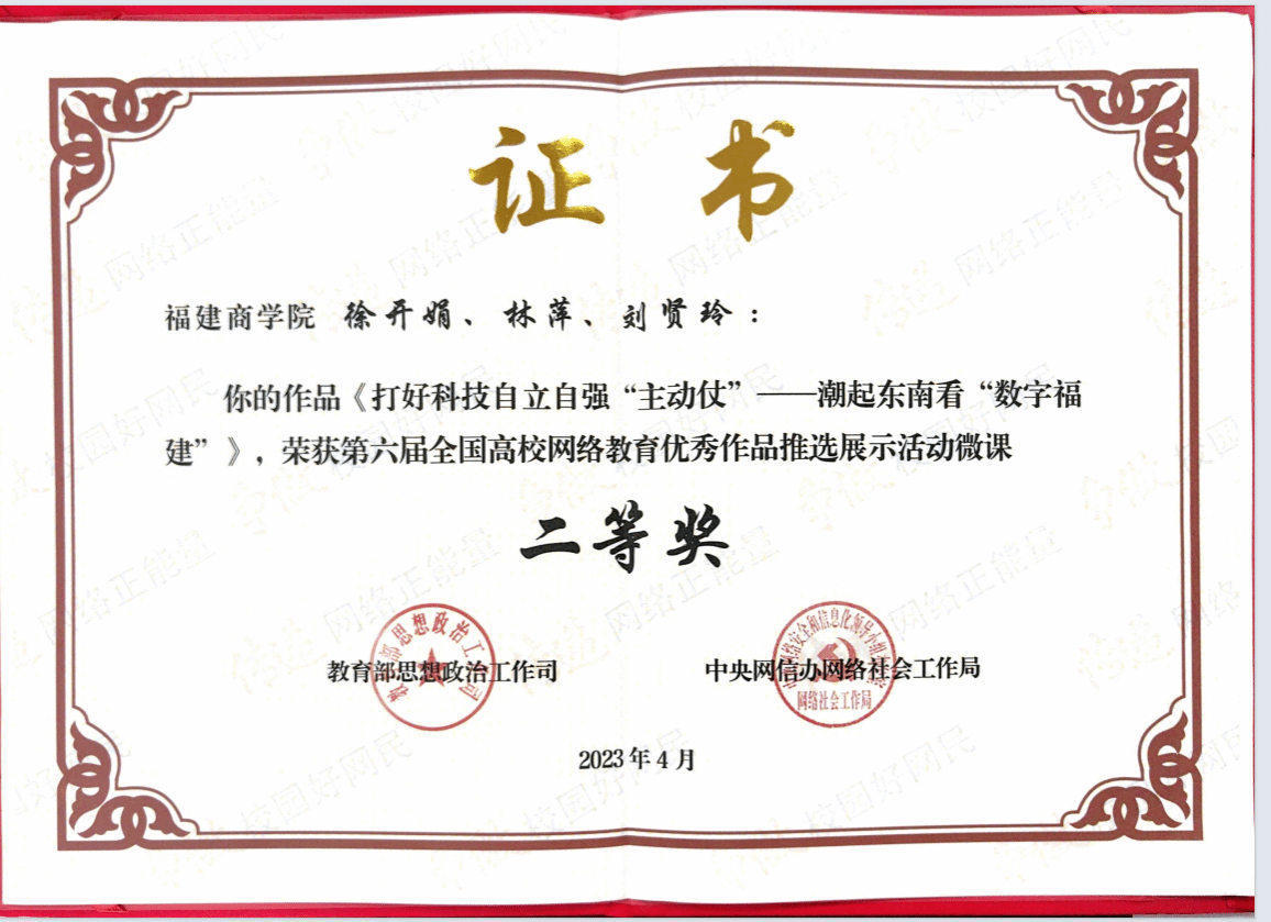 必赢官网徐开娟老师的作品《打好科技自立自强“主动仗”-----潮起东南看“数字福建”》,荣获第六届全国高校网络教育优秀作品推选展示活动微课二等奖。