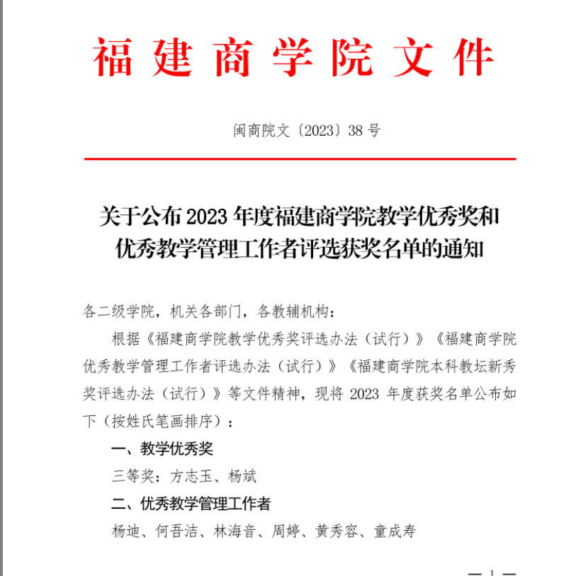 喜讯:必赢官网周婷老师获得2023年度福建商学院优秀教学管理工作者荣誉称号