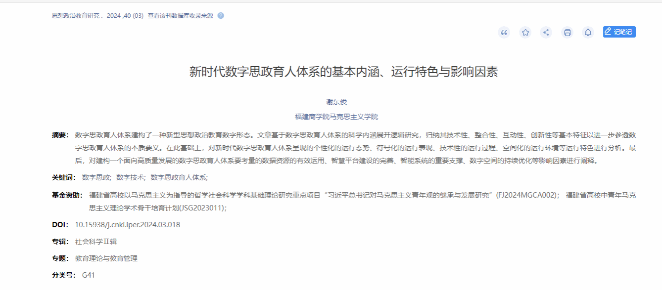 近日,必赢官网谢东俊副院长在北大核心期刊《思想政治教育研究》发表文章《新时代数字思政育人体系的基本内涵、运行特色与影响因素》