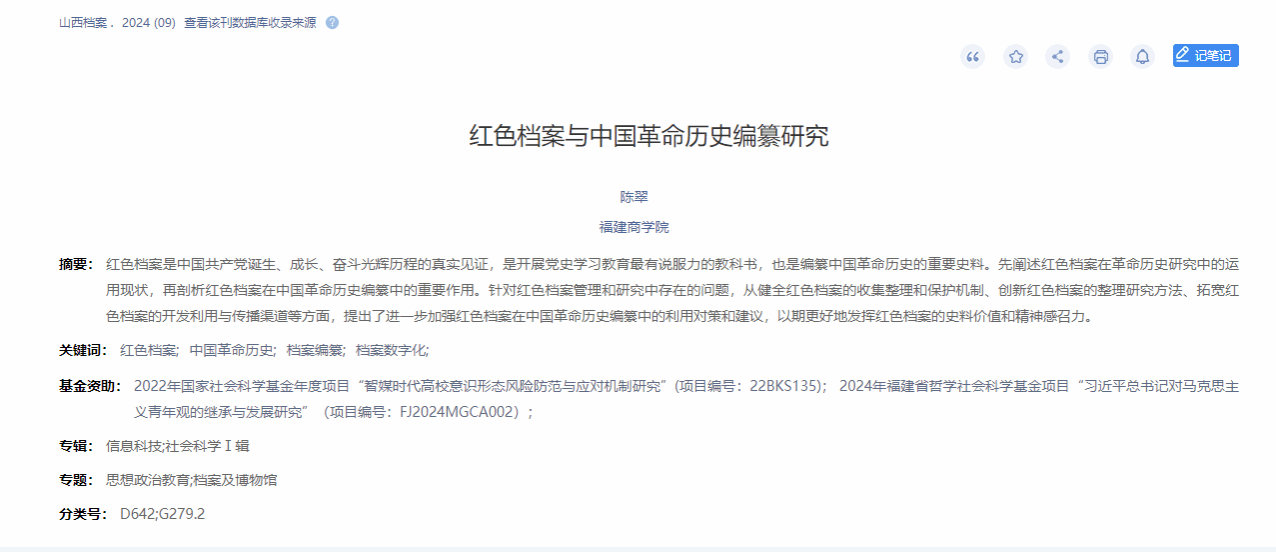 近日,必赢官网陈翠教师在北大核心期刊《山西档案》发表文章《红色档案与中国革命历史编纂研究》。