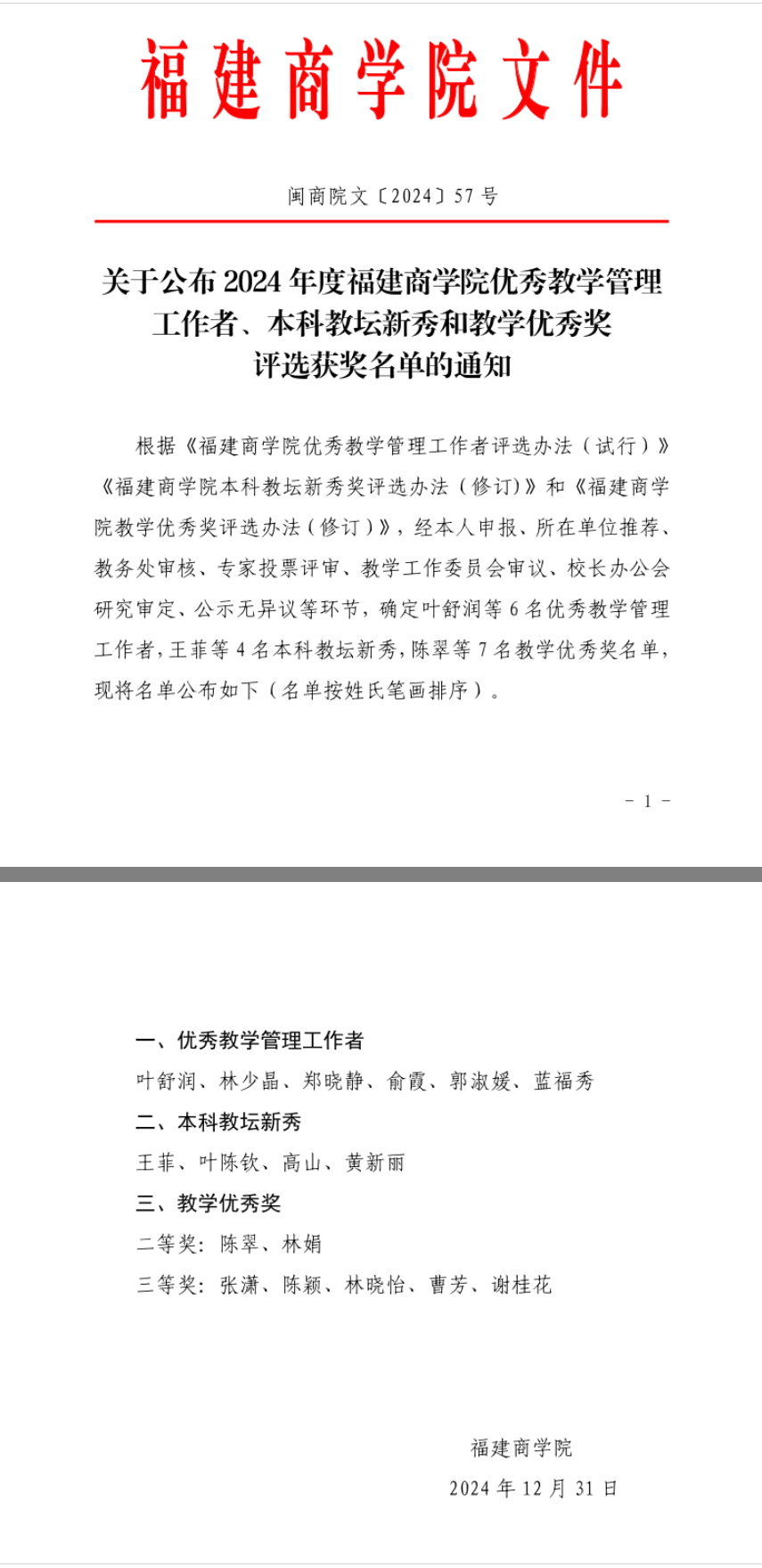 喜讯:经过评审,必赢官网蓝福秀老师获得2024年度福建商学院优秀教学管理工作者荣誉称号,叶陈钦老师获得本科教坛新秀荣誉称号,陈翠老师获得教学优秀奖荣誉称号。