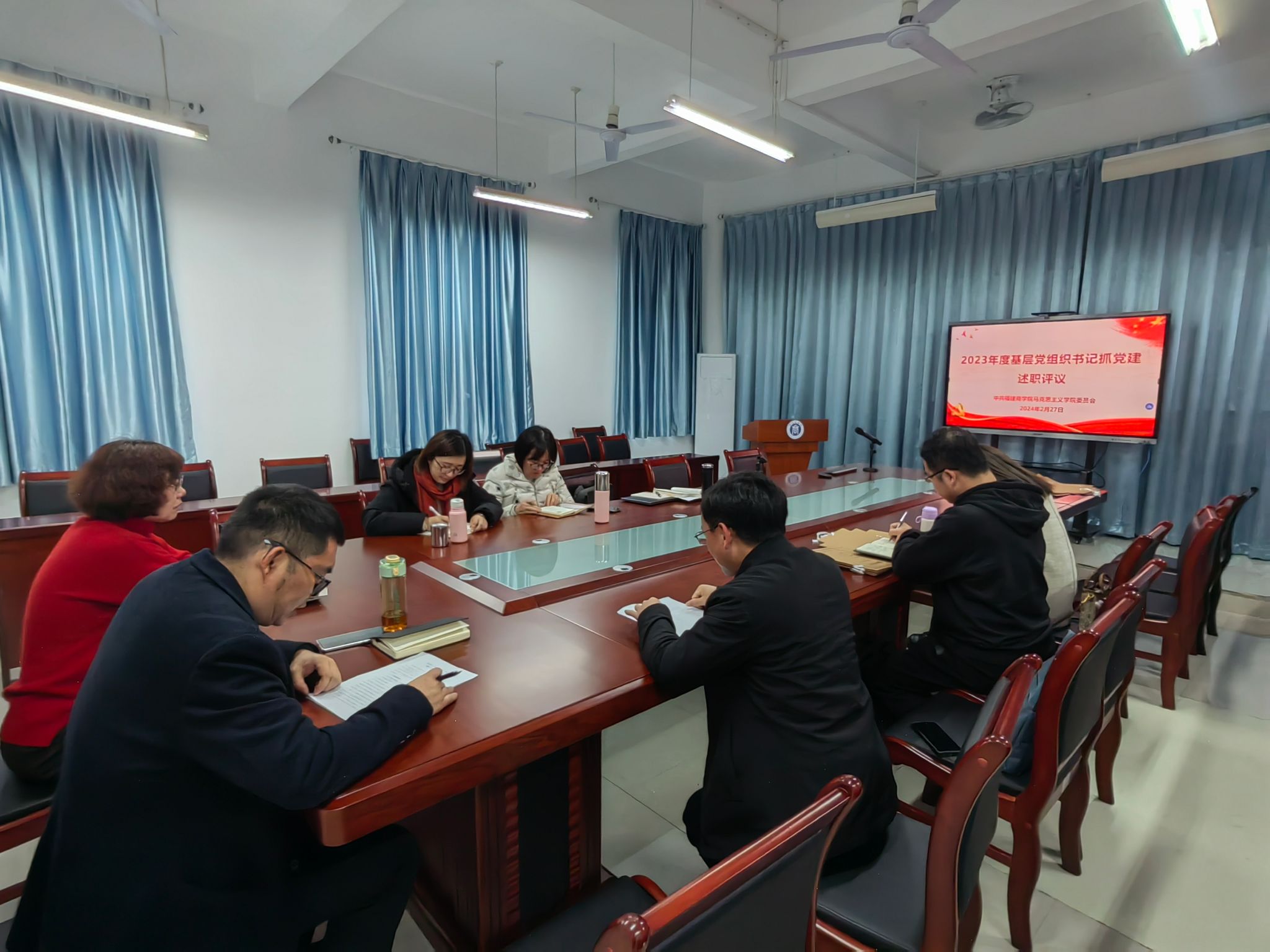 2月27日下午,必赢76net线路官网党委在诚信楼五楼会议室召开2023年度党支部书记抓基层党建述职评议会议。学院党委委员、各党支部书记及其支委委员参加会议。会议由院党委书记林萍主持。