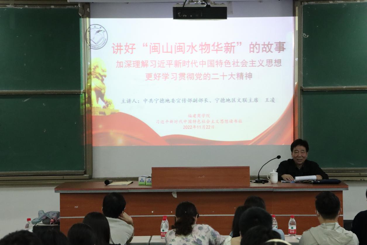 闽山闽水物华新,“习言习语”催人进。11月22日晚,中共宁德地委宣传部原副部长、原宁德地区文联主席王凌研究员受邀莅临我校,为我校师生作了题为《讲好“闽山闽水物华新”的故事,加深理解习近平新时代中国特色社会主义思想,更好学习贯彻党的二十大精神》的专题讲座。校党委副书记吴访益,必赢76net线路官网、机关党委负责同志,学校习近平新时代中国特色社会主义思想学生读书社、教职工读书社社员代表参加。