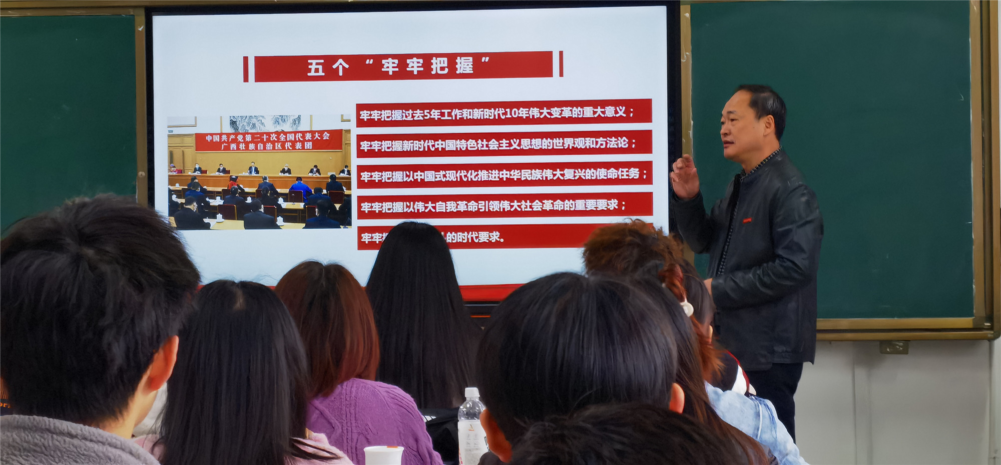 12月7日,校纪委书记、监察专员周训胜在连江校区诚信楼409为2021级烹饪与营养教育班学生讲授思政课,宣讲党的二十大精神。