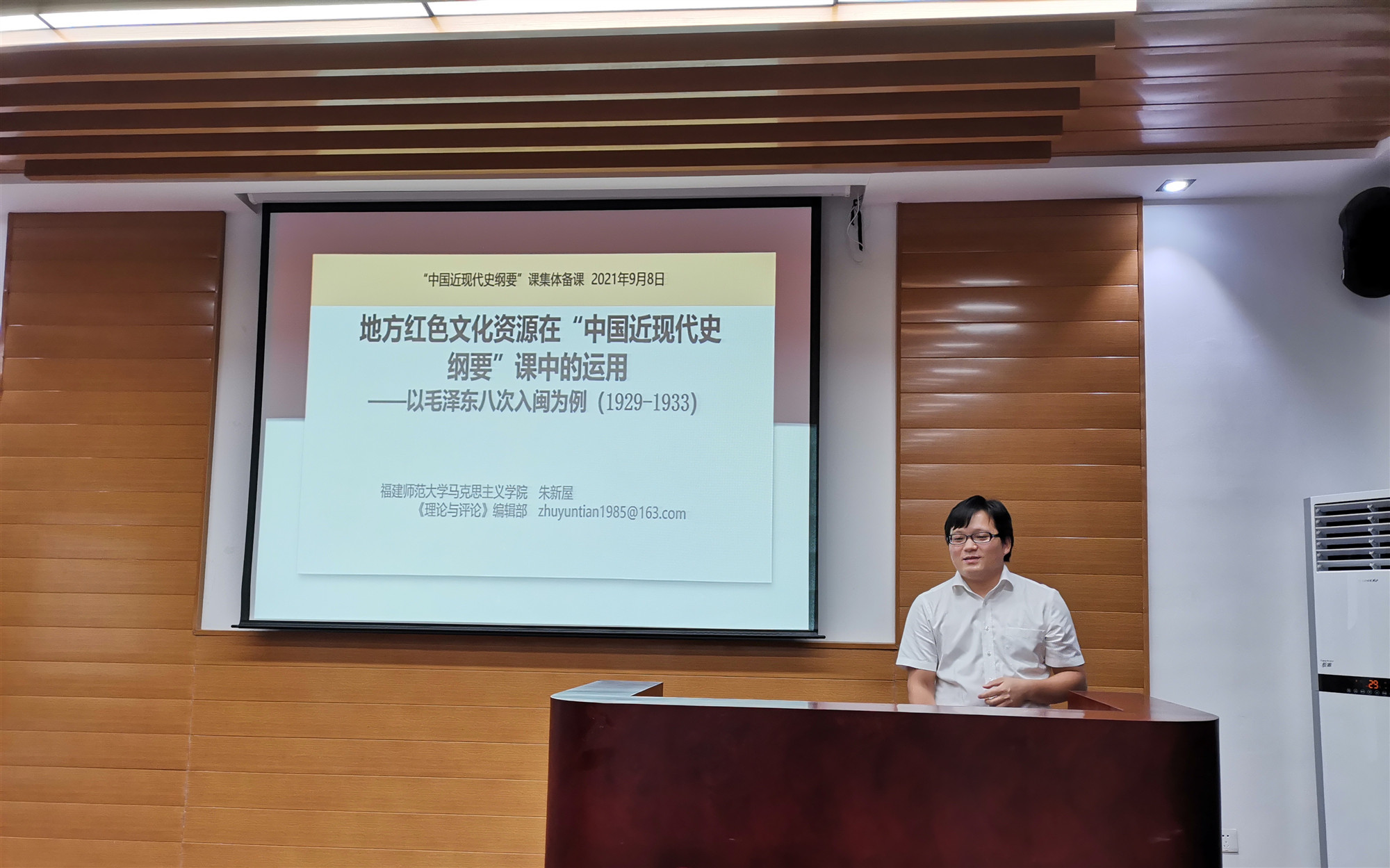 9月8日下午,党史学习教育省委宣讲团成员、福建师范大学朱新屋副教授应邀到我校作题为“地方红色文化资源在‘中国近现代史纲要’课中的运用——以毛泽东八次入闽为例(1929-1933)”的示范教学。校党委副书记吴访益和必赢76net线路官网教师参加学习。