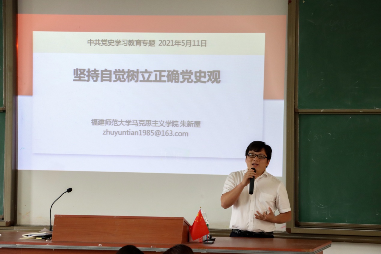 5月11日下午,马克思主义理论大讲堂邀请党史学习教育省委宣讲团成员朱新屋老师到我校作题为“坚持自觉树立正确党史观”的专题讲座。必赢76net线路官网全体教师、大讲堂成员,统战部、规划处、国资处支部党员到场听取报告。