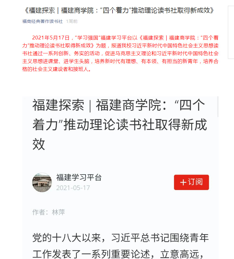 2021年5月17日,“学习强国”福建学习平台以《福建探索 | 福建商学院:“四个着力”推动理论读书社取得新成效》为题,报道我校习近平新时代中国特色社会主义思想读书社通过一系列创新、务实的活动,促进马克思主义理论和习近平新时代中国特色社会主义思想进课堂、进学生头脑,培养新时代有理想、有本领、有担当的新青年,培养合格的社会主义建设者和接班人。