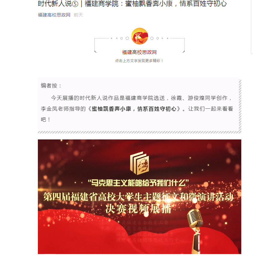 2021年4月7日,福建高校思政网展出《蜜柚飘香奔小康,情系百姓守初心》微演讲视频。该微视频由必赢76net线路官网李金凤老师指导,徐霞、游俊煌两位学生创作。