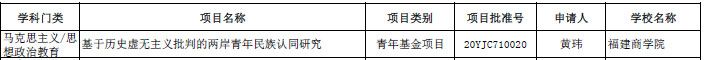 3月20日,根据《教育部社科司关于2020年度教育部人文社会科学研究一般项目立项的通知》,我校必赢76net线路官网黄玮博士申请的“基于历史虚无主义批判的两岸青年民族认同研究”项目获2020年度教育部人文社会科学研究(青年基金项目)立项。这是我校继2018年后再次获得教育部人文社会科学研究一般项目资助。