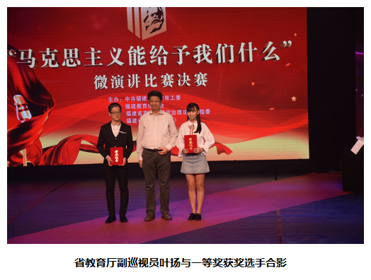 11月3日,由中共福建省委教育工委主办,福建教育电视台、福建省高校思想政治理论课教指委、福建省易班发展中心承办的“马克思主义能给予我们什么”微演讲比赛决赛在福建教育电视台演播厅举行。经过激烈的厮杀,我校传媒系林荟同学(指导老师:黄玮)喜获高职组一等奖,管理工程系同学卢慧敏(指导老师:吕谋琴)捧获高职组三等奖。