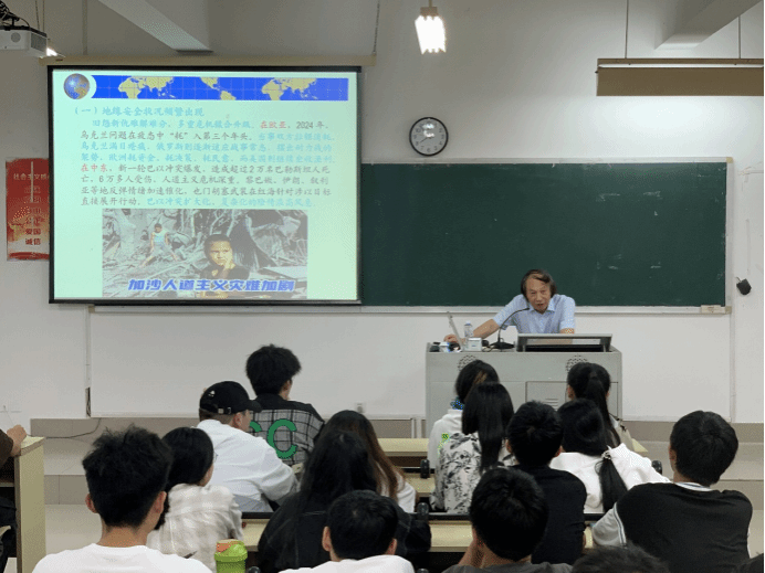 6月6日晚7点30分,福建江夏学院必赢76net线路官网郭健彪教授应邀到我校马尾校区远志楼T3教室作题为“当前国际局势与中国式现代化”的专题讲座,校马列经典著作读书社社员、校青马工程班学员共计90多人聆听了讲座。