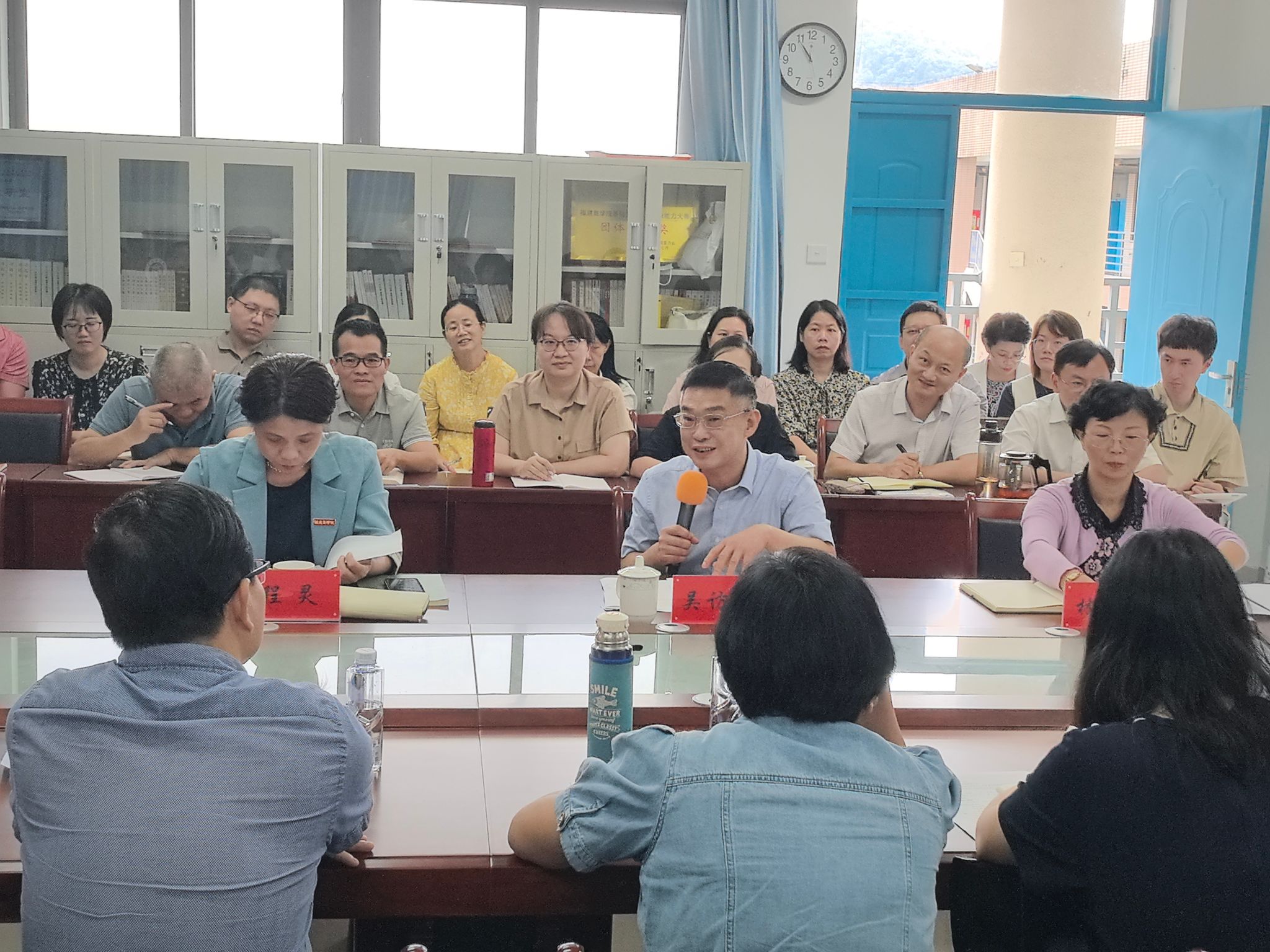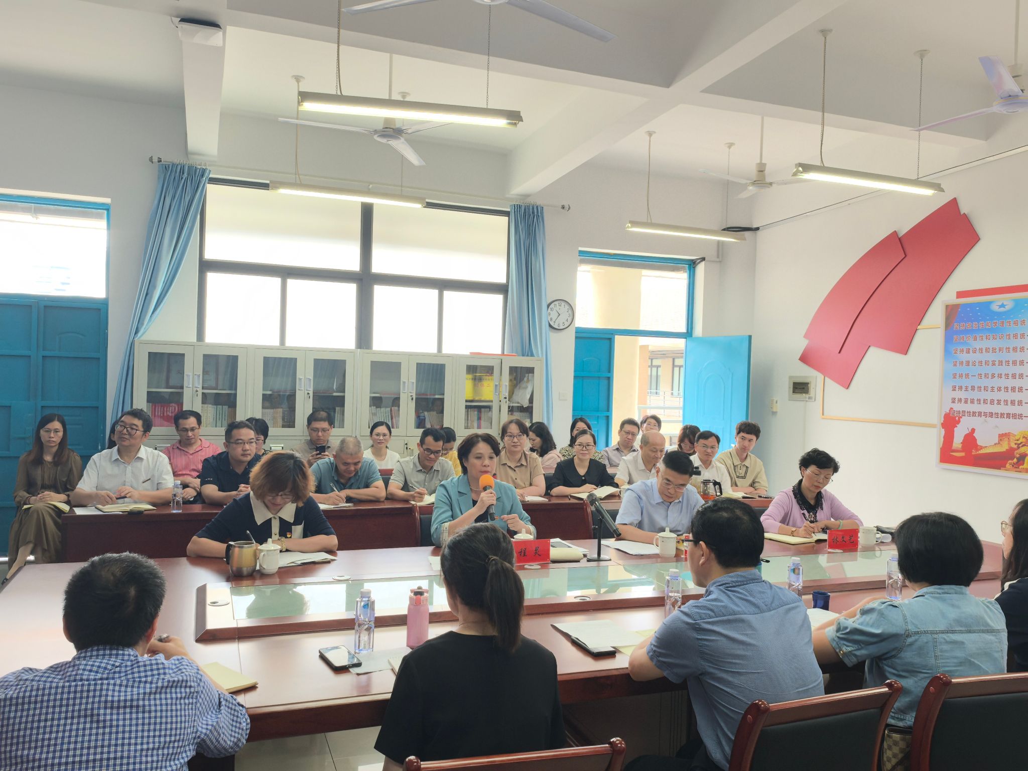 2024 年10月15日上午,校党委书记吴访益、校长程灵、副校长林文艺、教务处负责人、各二级学院领导、纪委纪检监察室相关人员赴必赢76net线路官网参加“党的二十届三中全会精神融入思政课程”教学集备活动暨现场办公会。必赢76net线路官网全体教师参加。