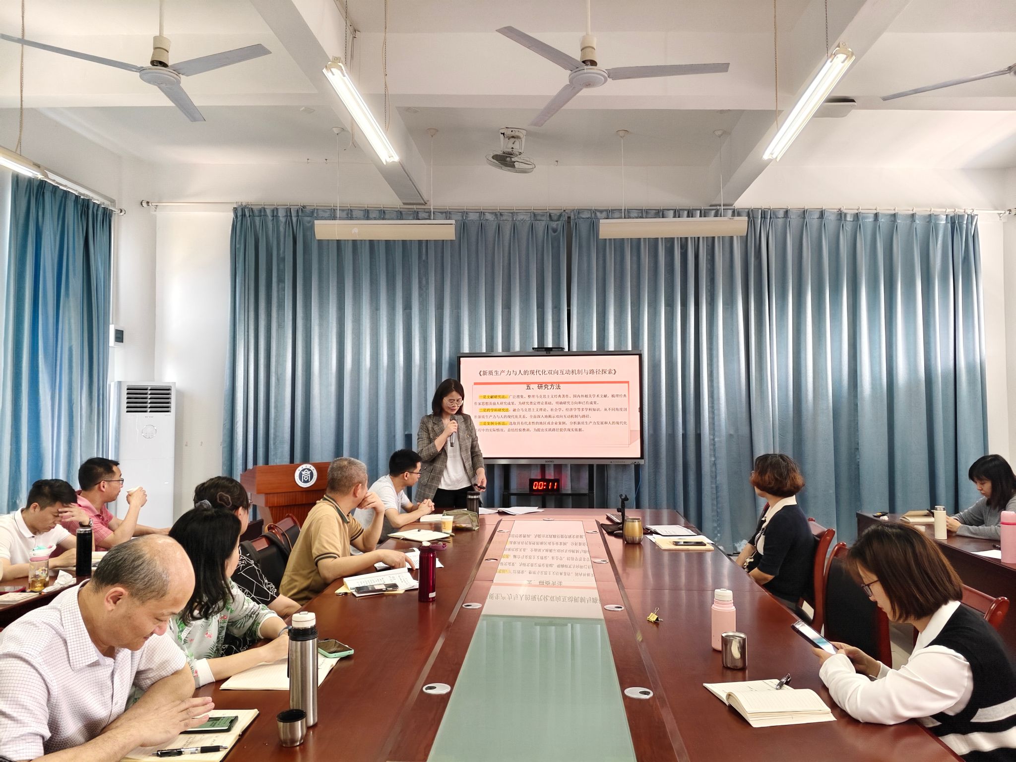 蔡珍美、李雪飞分别以《数智化赋能福建民营经济高质量发展研究》《新质生产力与人的现代化双向互动机制与路径探索》为题,分享了各自在项目选题、研究内容、结构设计、形式规范等方面的做法和体会。