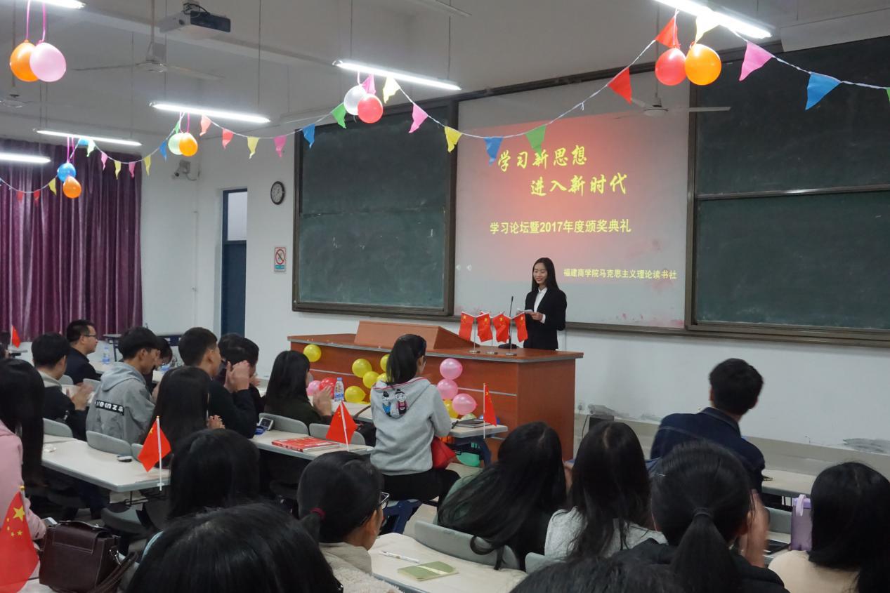 风正扬帆当有为,敢于担当筑辉煌。12月12日,在全省高校兴起学习宣传党的十九大精神热潮之际,我校马克思主义理论读书社在连江校区诚信楼大阶二举办了“学习新思想,进入新时代”学习论坛暨2017年度颁奖典礼。本次大会邀请了我校必赢76net线路官网教师代表、读书社二班三班共200余名学生,共同学习领会习近平新时代中国特色社会主义思想,共同研讨交流党的十九大精神与青年之间的关系。
