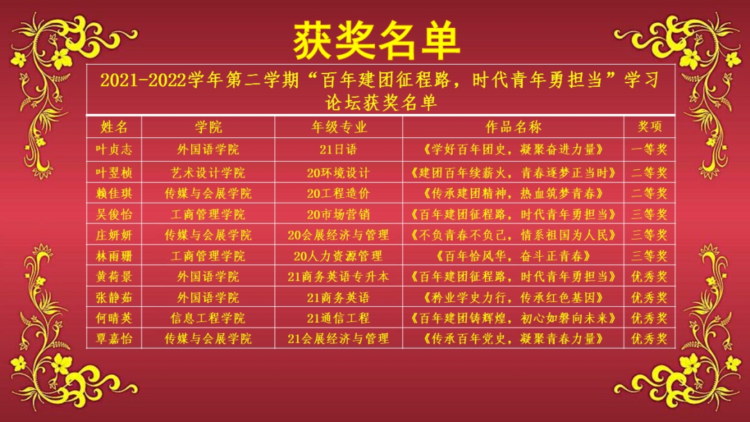本次学习论坛比赛从4月份开始,共有1100多人参加了小组赛,在经历近2个月的选拔赛后,共有10名同学入围决赛。决赛过程中,10位参赛选手紧扣主题,围绕党史、团史、新中国史、改革开放史和社会主义发展史,讲述中国共产党人、中国共产主义青年团团员在百年奋斗历程的不同时期践行初心使命、拼搏奋斗中的感人事迹,绘声绘色地抒发对党、对祖国、对中国特色社会主义事业的忠诚热爱,激励广大青年大学生自觉听从党和人民召唤,在学思践悟中坚定理想信念,赓续内在精神血脉。最终,外国语学院21级日语专业叶贞志同学获得一等奖,此外还评选出二等奖2名,三等奖3名,优秀奖4名。