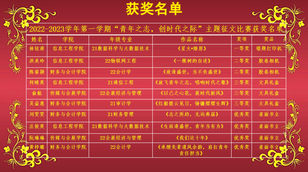 青年如朝日,青年兴则国兴。自11月活动开展以来,读书社全体社员热情投入、踊跃参加,经必赢76net线路官网组织开展初选、复选,推出10篇优秀征文,经过评审,最终评出一等奖1名,二等奖2名,三等奖3名,优秀奖4名。