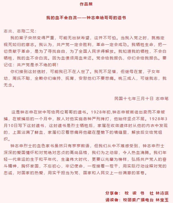 今天第一期为大家带来2020级审计学1班林诗琪分享的《我的血不会白流——钟志申给哥哥的遗书》,朗诵者林宝玉。
