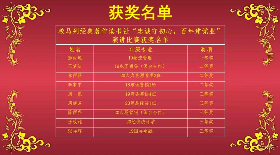 2021年是中国共产党建党100周年,在这特殊的历史节点,为向党的一百岁生日献礼,同时也为坚定大学生不忘初心跟党走的信念,我校马列经典著作读书社于2021年4月21日晚19:30在马尾校区非洲厅举办“忠诚守初心,百年建党业”主题演讲比赛,必赢76net线路官网陈火荣老师、蓝庆专老师应邀担任本次比赛评委。